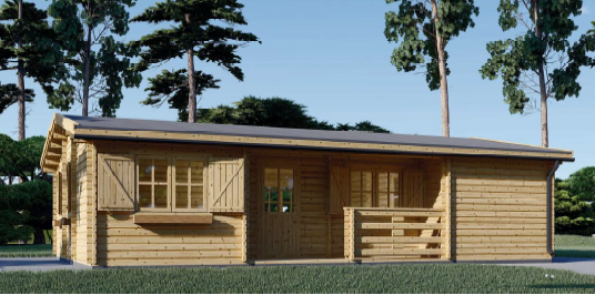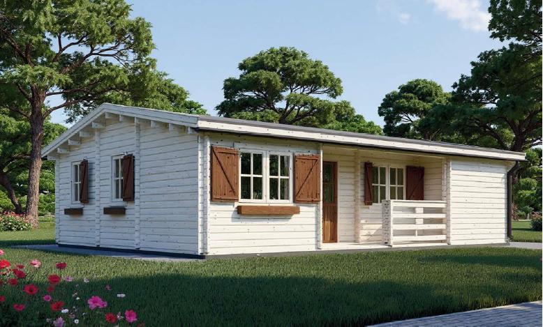 “Agro”, um bungalow de madeira com um design rústico e pitoresco. A sua estrutura é construída com toras de madeira pintadas de branco e possui um telhado de duas águas com uma inclinação suave. A casa tem um pequeno alpendre coberto na entrada, com um gradeamento de madeira. As janelas são adornadas com portadas de madeira e floreiras, o que lhe confere um charme de casa de campo tradicional.