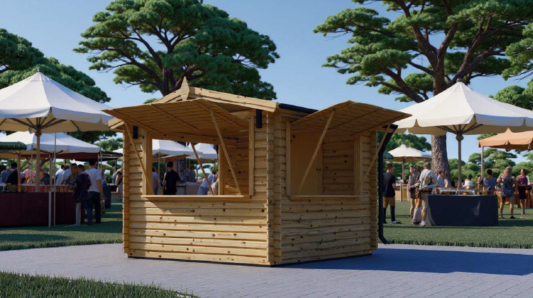 Esta é uma banca ou quiosque comercial de madeira, projetado para feiras, mercados ou eventos ao ar livre. A sua estrutura é robusta, feita de toras de madeira horizontais, possui um design funcional com grandes aberturas frontais que servem como balcão de atendimento. O telhado, também em madeira, tem um formato característico que oferece abrigo tanto para o interior do quiosque como para os clientes.