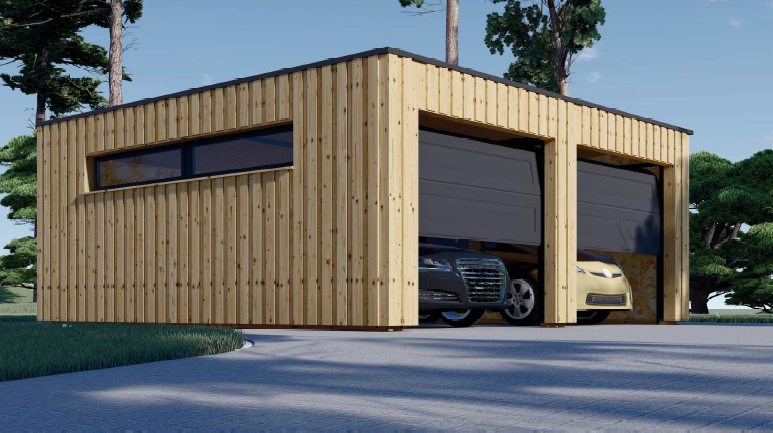 Garagem dupla combina um design moderno com a funcionalidade de abrigar dois veículos. A sua estrutura é retangular, com um telhado de uma só água (plano inclinado) e um reæstirnento em ripas de madeira verticais, que lhe confere uma estética contemporânea. Possui dois portões de garagem seccionados.