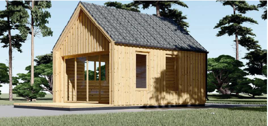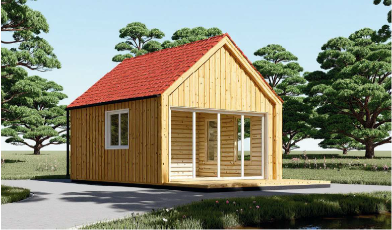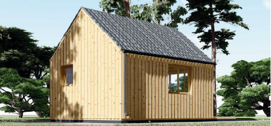A fachada principal é amplamente envidraçada, com portas de correr que se abrem para um pequeno alpendre, criando um espaço luminoso e convidativo. O seu formato compacto e o design apelativo tornam-na perfeita para alojar visitas com conforto e estilo.