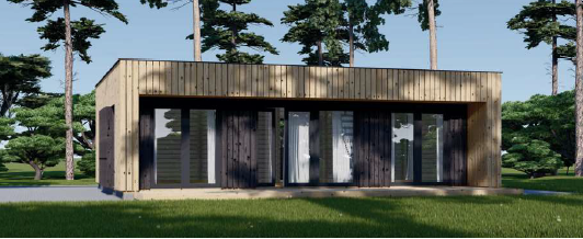 A sua estrutura é cúbica, com um telhado plano e um revestimento em ripas de madeira verticais. A fachada principal é amplamente envidraçada, com várias janelas altas e portas de vidro que garantem um interior extremamente luminoso e uma forte ligação com o ambiente exterior. O seu visual é limpo e sofisticado, ideal para quem procura uma habitação compacta, um escritório de jardim ou um estúdio com uma estética moderna.
