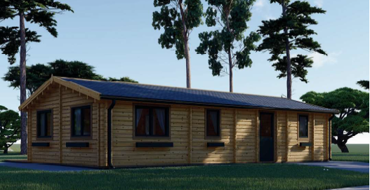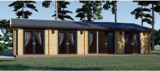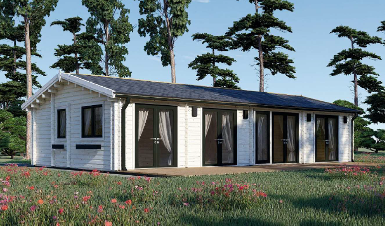 “Provençal”, um bungalow de madeira com um design clássico e elegante. A sua &utura alongada, com reæstmento em madeira pintada de branco, com o telhado escuro de duas águas com uma inclinação suave. A fachada principal é marcada por uma série de portas janelas de vidro com caixilharia escura, que se abrem para o exterior e garantem um interiorluminoso.