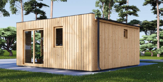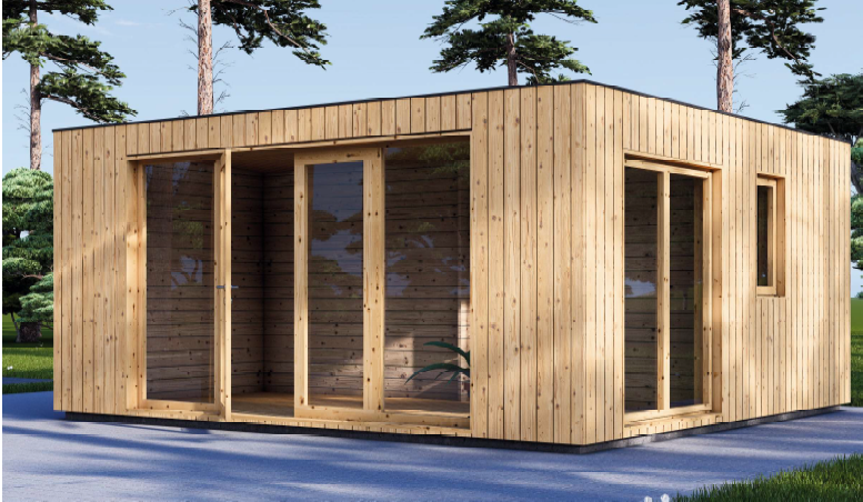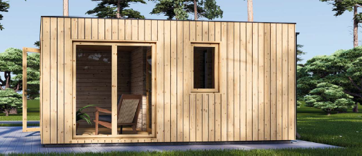 Uma estrutura de madeira com um design moderno, concebida para ser um espaço de relaxamento e bem-estar, como uma sauna ou uma pequena área de spa privativa no jardim.
