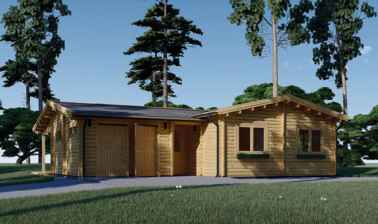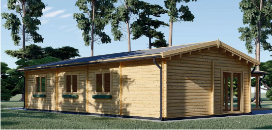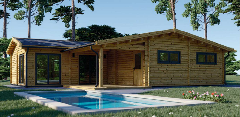 A casa familiar ‘Solar’, um bungalow de madeira com um design de cabana rústica. A sua estrutura, em forma de “L”, é construída com toras de madeira possui um telhado de duas aguas. Um alpendre coberto, integrado na cria uma área de estar no exterior abrigada junto à piscina. A casa tem várias janelas e portas com caixilharia escura, que contrastam com a madeira de tom médio. O seu design é ideal para uma habitação familiar que procura um estilo de vida descontraído e em contacto com o exterior