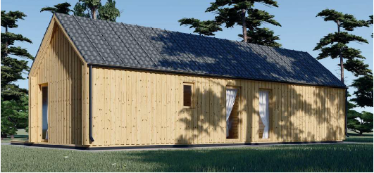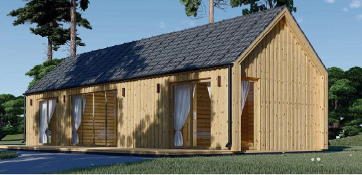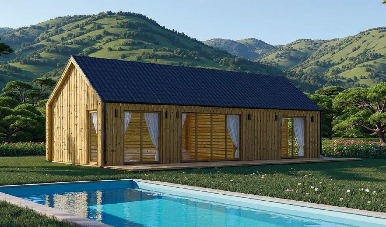 ‘Turística”, uma “tiny house” com um design de bungalow moderno, ideal para alojamento local ou casa de férias. A sua estrutura alongada, com revestimento em ripas de madeira verticais e um telhado de duas águas com telhas escuras, combina um visual rústico com linhas contemporâneas. A fachada principal, virada para a piscina, possui várias portasjanelas de vidro que garantem uma excelente iluminação natural e uma ligação direta com a área de lazer exterior.